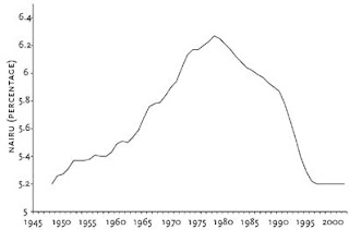Using similar, but more refined, methods, the Congressional Budget Office estimated (Figure 3) that NAIRU was about 5.3 percent in 1950, that it rose steadily until peaking in 1978 at about 6.3 percent, and that it then fell steadily to about 5.2 by the end of the century. Clearly, NAIRU is not constant. It varies with changes in so-called real factors affecting the supply of and demand for labor such as demographics, technology, union power, the structure of taxation, and relative prices (e.g., oil prices). NAIRU should not vary with monetary and fiscal policies, which affect aggregate demand without altering these real factors.
